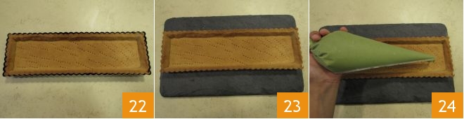 Bake in a preheated static oven at 340°F for about 15 minutes on the middle rack until golden brown 22. Then let it cool completely before unmolding 23. At this point, work the cream for a few seconds with a spatula, transfer it to a piping bag and use it to fill the tart 34.