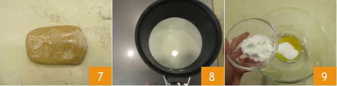 Make a dough ball and wrap it in plastic wrap 7 and place it in the refrigerator to firm up for at least 40 minutes. In the meantime, start preparing the matcha tea cream. Pour the milk into a saucepan 8 and heat it until it almost boils. Meanwhile, pour the egg yolks, sugar, and cornstarch into a bowl 9; quickly beat with a whisk.