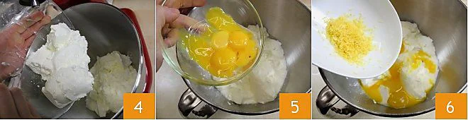 Move on to the filling: in a large bowl place the fromage blanc 4, the egg yolks 5, the grated zest of an untreated lemon 6.