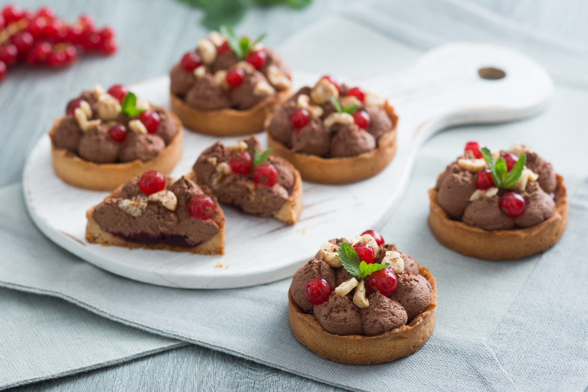 These easy chocolate tartlets look impressively intricate, yet are surprisingly simple to make. With each bite, you get a moist, buttery crust, smooth chocolate cream, a hint of sweet fruit, and that nutty crunch. They're perfect for both family lunches and dinner parties.