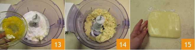and finally the egg 13. Turn on the mixer for a few minutes until you obtain a homogeneous mixture 14. Transfer it onto a work surface, knead it just enough to compact the dough. Wrap in plastic wrap 15 and transfer to the refrigerator for at least 1 hour. If you prefer, you can leave the dough in the refrigerator for up to 12 hours.