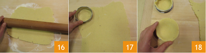 After the resting time, roll out the dough on a lightly floured surface to a thickness of about 1/4 inch 16. Use a round cutter with a diameter of about 3 1/2 inches 17 to cut out discs and place each disc inside a tartlet mold lined with parchment paper with a diameter of about 2 3/4 inches 18.