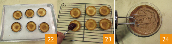 Remove the baking beans 22 and the molds. Transfer to a wire rack and fill with raspberry jam 23. Retrieve the namelaka and beat it with an electric whisk until it is well whipped 34, then transfer it to a piping bag with a plain nozzle.