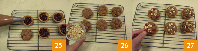 Decorate the tartlets with namelaka 25, coarsely chopped hazelnuts 26, and red currants 27.