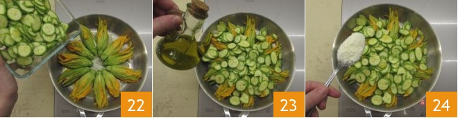At this point, cover the zucchini flowers with the sliced zucchinis 22, drizzle with a little oil 23, salt, pepper, and another tablespoon of Grana Padano 34, and let them cook for a few more minutes.