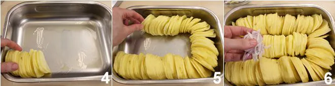 Place the slices vertically in a row in the baking dish 4 (take ten at a time so that they will stand upright), forming 3 rows of potatoes inside it 5. Cut the shallots into slices and place them in the empty spaces between the potatoes 6,