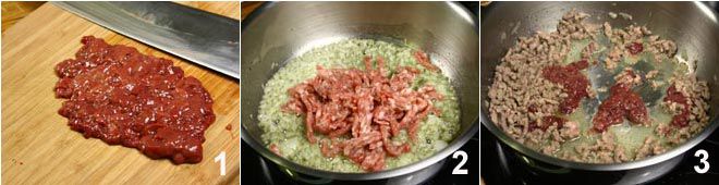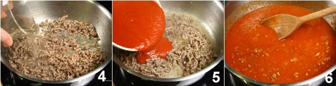 Let them brown for another 5 minutes, then deglaze with wine 4 and add the tomato puree 5. Salt, pepper, and let it cook over moderate heat until the sauce has thickened and reduced 6.
