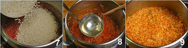 When the sauce is ready, add the rice 7 and, stirring often, cook the rice, adding meat broth 8 when needed, until the risotto appears dry and compact 9.