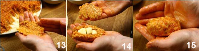 Meanwhile, cut the mozzarella into pieces or strips and let it drain in a colander to eliminate excess water. When the rice is cold, form the supplì by taking a little mixture with wet hands and shaping it into an oval shape 13: insert a couple of pieces of mozzarella into the center of the supplì 14, then close it well 15. Continue until all the ingredients are used up.