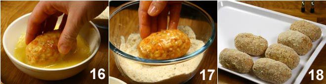 Once all the supplì are made, dip them in the beaten egg 16 and then in the breadcrumbs 17, ensuring the breadcrumbs adhere on all sides 18.