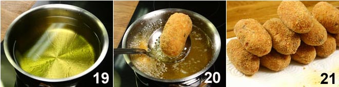 Then, fry the telephone supplì in abundant hot oil (at least 356°F), turning them several times so all sides become more than golden. The supplì should float in the oil, which must be abundant. If you want to avoid using large quantities of oil, use a rather small and tall saucepan, or, for convenience, use a deep fryer. Let the telephone supplì drain on a sheet of absorbent paper 21 and serve hot.
