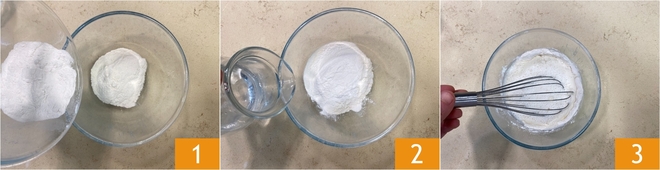 To prepare the tempura shrimp, first prepare the batter: in a bowl combine the rice flour and all-purpose flour 1, then pour in the cold sparkling water 2 and mix well with a whisk to avoid lumps 3.