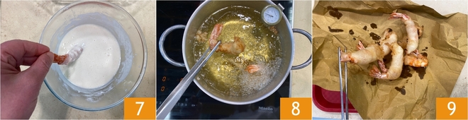 After the resting time, you're ready to fry: heat the vegetable oil to 340°F-355°F and dip each shrimp in the batter holding it by the tail 7. Drop the shrimp into the hot oil and fry them for 1-2 minutes 7; the batter should not color but remain light. Drain the shrimp on paper towels or fry paper to remove excess oil 9.