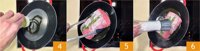 Heat the extra virgin olive oil in a cast iron casserole 4 and place the piece of meat inside 5, then salt it 6.