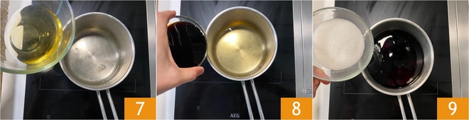 Add the sake 7, soy sauce 8, and sugar 9.