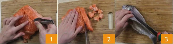 To prepare the fish and spinach terrine, start by cleaning the fish: take the salmon, remove the skin and bones, if present, using tweezers 1, then cut it into pieces 2 and set it aside. Next, move on to cleaning the How to clean the sea bream: remove the skin, fillet it 3