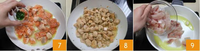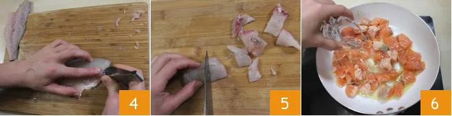 and remove any bones with tweezers 4, then cut it into pieces 5. Proceed in the same way to clean the perch and cut it into pieces as well. In a non-stick pan, with two tablespoons of oil and one clove of garlic, cook the salmon over moderate heat, deglaze with 1 oz of white wine 6, then season with salt and pepper