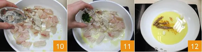 deglazing with the remaining white wine 10, adding a generous handful of chopped parsley 11, and adjusting salt and pepper. Let everything cook for a few minutes over moderate heat, then set the cooked fish aside.