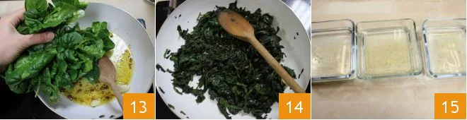 Clean and wash the spinach thoroughly under running water, drain them and sauté for a few minutes, over moderate heat, in a non-stick pan with two tablespoons of oil, three cloves of garlic, and the anchovy fillets 13. When they are cooked, turn off the heat and keep them aside 14, but warm. In three different bowls filled with cold water, soak the gelatin sheets: 1 tsp for the salmon, 1 tsp for the sea bream and perch, and 1 1/2 tsp for the spinach 15.