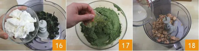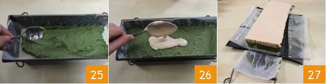 Using a blender, blend the spinach with the ricotta 16 and, if necessary, adjust salt and pepper. Add the well-wrung gelatin sheets to the still warm spinach mixture and dissolve them thoroughly 17. Now blend the salmon with 1/2 cup of cream 18,