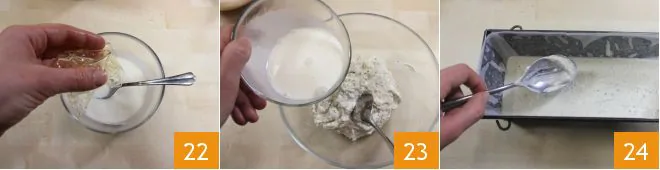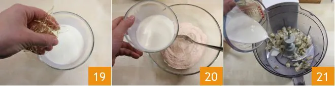 dissolve the gelatin sheets in 1/4 cup of warm cream and mix them into the mixture (19-20). Then blend the perch and sea bream with 1/2 cup of cream 21