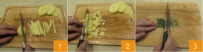 To prepare the porcini terrine, start by preparing the potatoes. Wash and peel them, then cut them into slices and then into strips 1, then into cubes 2; set them aside. Finely chop the rosemary 3.