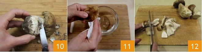 Now move on to preparing the How to Clean Porcini Mushrooms: with a small knife, remove the earthy part by scraping it off 10. If the mushrooms have little soil, you can simply remove it using a brush 11. Cut the porcini into slices lengthwise 12.