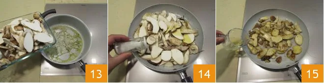 Take another non-stick pan, heat a drizzle of oil with the chopped rosemary and add the porcini 13. Season with salt 14 and pepper. Cook over moderate heat for about 7-8 minutes, then deglaze with white wine 15.