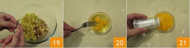 Add the washed and dried thyme leaves 19. In a separate small bowl, beat the eggs with a fork 20 and season with salt 21.