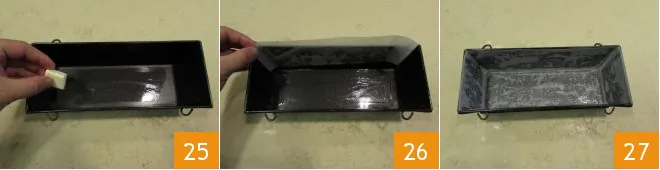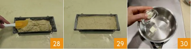 Butter a mold 2.75 inches high, 3.94 inches wide, 10.63 inches long 25 and line it with parchment paper 26, making sure the parchment paper adheres well to the edges 27.