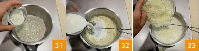 When it is completely melted, sprinkle in the flour 31 while stirring well with a hand whisk to avoid lumps. Continue to stir until the roux is well golden. Add the lukewarm milk 32 and continue to stir until the béchamel thickens. Then turn off the heat and add the grated Asiago cheese 33, melting it into the béchamel with the hand whisk.