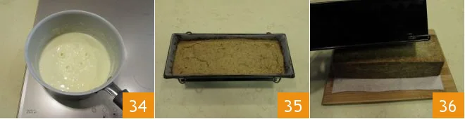 You will need to whisk the mixture until it is homogeneous 34 and the cheese is completely melted. Then transfer it to a kitchen squeeze bottle and set it aside. After the baking time, remove the terrine from the oven (you may perform the toothpick test) 35. Turn it over onto a serving plate 36, being careful to remove the parchment paper.