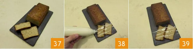 Cut some slices 37 and with the squeeze bottle containing the fondue, decorate the slices of the porcini terrine 38 and serve them warm 39!