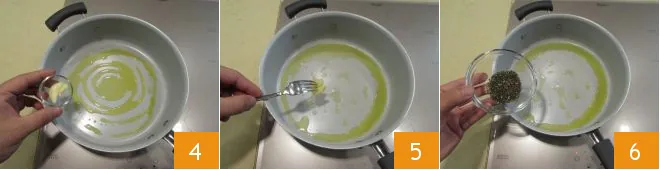 Sauté a clove of garlic in a non-stick pan with oil 4. When it is golden, remove it 5, add the chopped rosemary 6 and mix it with the oil.