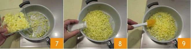 Add the potatoes 7 and season with salt 8 and pepper. Heat over moderate heat and continue to stir the potatoes to achieve even cooking 8, until you observe a light golden crust on the surface: it will take about 5 minutes. Set aside.