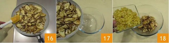 Stir the mushrooms 16 until they are cooked, with a light crust on the surface and an amber color: it will take another 3 minutes. Pour them into a bowl 17 and let them cool for about 10 minutes. Also add the potatoes to the bowl 18.