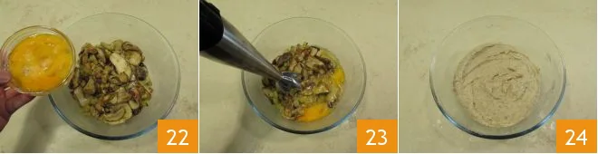 Pour the beaten eggs into the bowl with potatoes and mushrooms 22 and use an immersion blender to blend the ingredients 23 until you obtain a homogeneous mixture. Mix the ingredients well 34.