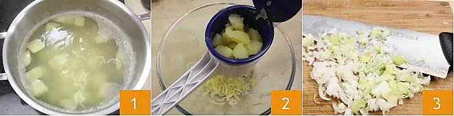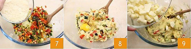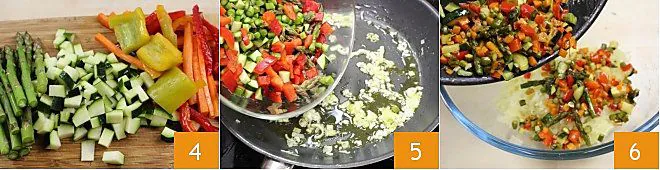 Meanwhile, clean and cut the vegetables into small cubes 4 (carrots, asparagus, zucchini, peppers), then add them to the spring onion and sauté over low heat until they become tender 5. Once cooked, season with salt, let cool, and add to the potatoes 6.