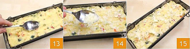 pour the potato-based mixture into the mold, level it with the help of a spoon 13, and sprinkle it with the grated cheese set aside 14. Bake in a static oven for 50 minutes at 356°F 15. Once ready, remove the terrine with thousand flavors from the mold and serve it still hot.