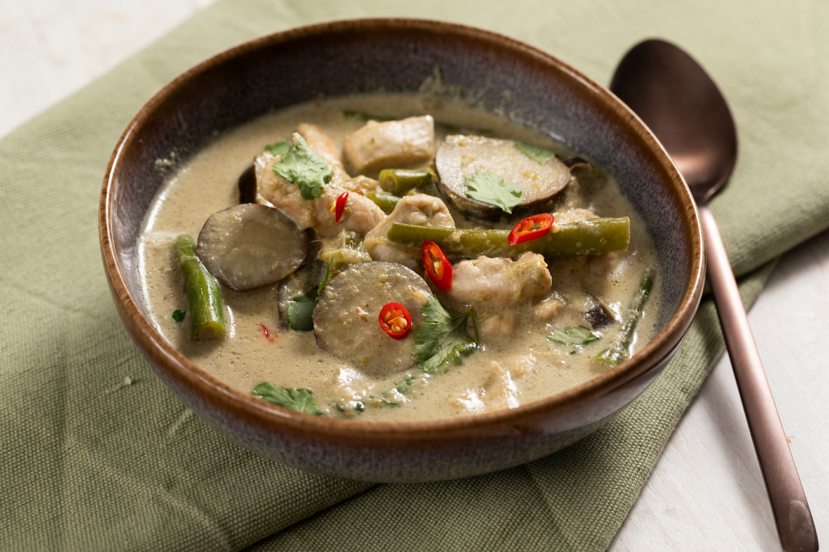 Plate it, and complete with chili pepper 28 and fresh coriander 29. Your Thai green curry is ready to be served 30