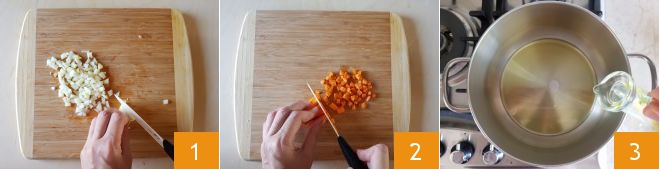 To prepare the three-grain soup with lentils and potatoes, first, take care of the sauté: clean the onion and finely chop it 1, peel the carrots and cut them into strips and then into small cubes 2. Now pour the oil into a pan 3