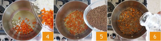 Add the chopped vegetables for the sauté 4 and cook over moderate heat for a few minutes, then add the lentils 5 and cover with water 6.