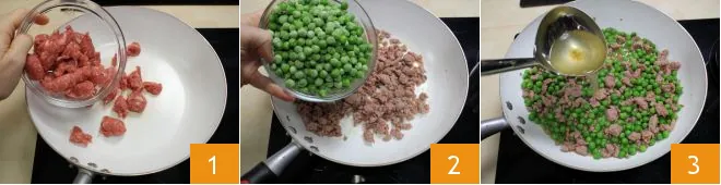 To make the macaroni pie, prepare the Easy Shortcrust Pastry: put the flour, cold butter from the fridge, and a pinch of salt in a food processor and blend until you get a sandy and floury mixture. Place the mixture obtained on a cold work surface, in the classic fountain shape, and knead quickly, gradually adding cold water until you have a compact and elastic dough. Cover everything with cling film and let it rest in the fridge for at least 40 minutes. Now prepare the sauce: crumble the sausage with your hands and cook it in a non-stick pan for a few minutes 1, until it is browned; add the frozen peas 2, mix and add a ladle of broth 3. Let it cook for about 30 minutes over medium heat, stirring often to prevent the meat from sticking to the bottom of the pan. After the indicated time, turn off the heat and set aside.