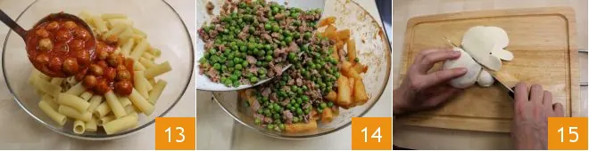 Add a generous ladle of sauce with the meatballs 13 and the peas with sausage 14 to the pasta. Cut a mozzarella into thin slices 15, then take the shortcrust pastry from the fridge and, with the help of a rolling pin, roll it out into two sheets not too thin.