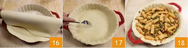 Take a round baking pan with a diameter of 28 cm and line the bottom with a sheet of shortcrust pastry 16, pricking the surface with the prongs of a fork 17. Start assembling the pie by layering the pasta 18,