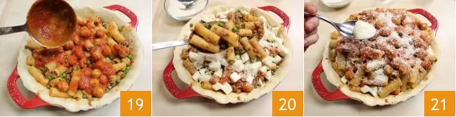 the meatballs in sauce 19, the mozzarella, and the pasta again 20: continue this way until all the ingredients are used. Finally, sprinkle with plenty of Grana Padano DOP 21;