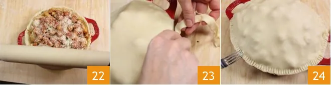 And cover the surface with the second sheet of shortcrust pastry 22. Using a knife, trim the excess pastry 23, then seal the edges by gently pressing with the prongs of a fork or with your fingertips 34.