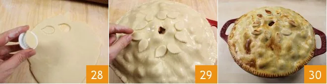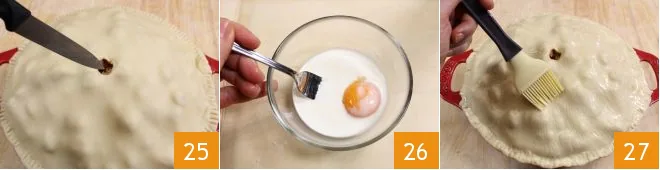 Create a hole in the center 25 to allow steam to escape during cooking, leaving the crust crispy and not soggy. Beat one egg yolk with a little cream 26 and brush it over the surface of the pie 27.