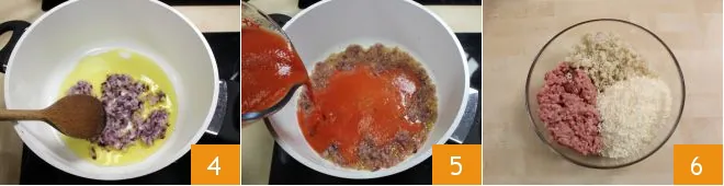 In a separate pot, brown the finely chopped onion for a couple of minutes 4 over low heat, along with 2 tablespoons of extra virgin olive oil, then add the tomato sauce 5. Continue cooking for a quarter of an hour and, in the meantime, prepare the meatballs: in a large bowl, put the minced pork, Grana Padano DOP, crumbled bread crumbs 6,