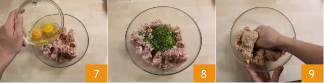 then add two eggs 7, the parsley 8, and season with salt and pepper. Mix all the ingredients with your hands until you get a homogeneous mixture 9,
